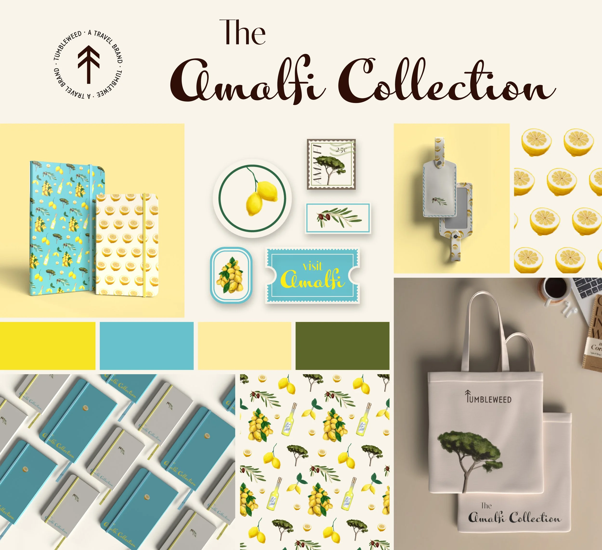My core collection of products included a range of travel accessories such as a travel journal, luggage tag, and stickers. I also created an example of what a location-inspired special collection would look like, which highlighted how the brand could be expanded beyond the core collection.